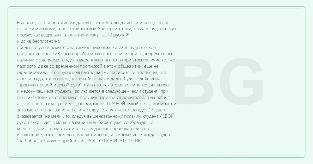 В давние, хотя и не такие уж далекие времена, когда институты еще были политехническими, а не Техническими Университетами, когда в студенческих профкомах выдавали талоны (на месяц - за 12 рублей! и даже бесплатно)на обеды в студенческих столовых-тошниловках, когда в студенческое общежитие после 23 часов пройти можно было лишь при одновременном наличии студенческого удостоверения и паспорта (при этом наличие только паспорта, даже со временной пропиской в этом общежитии, еще не гарантировало, что неусыпная вахтерша смилостивится и пропустит), но даже и тогда, как и после, как и сейчас, как и далее будет - действовало "правило правой и левой руки". Суть его, как это знают многие учившиеся и недоучившиеся студенты, заключается в следующем: если студент "при деньгах" (получил стипендию, получил перевод от родителей, "нашел" и т. д.) - то при просмотре меню, он закрывает ПРАВОЙ рукой цены, выбирает и заказывает по названиям. Если же вдруг (ох! как часто это вдруг) студент оказывается "на мели", то, следуя вышеназванному правилу, студент ЛЕВОЙ рукой закрывает в меню названия и выбирает уже, сообразуясь с мелководьем. Правда, как и всегда, у данного правила тоже есть исключение, о котором вспоминают многие, и я в том числе: когда студент "на бобах", то можно прийти - и ПРОСТО ПОЧИТАТЬ МЕНЮ.