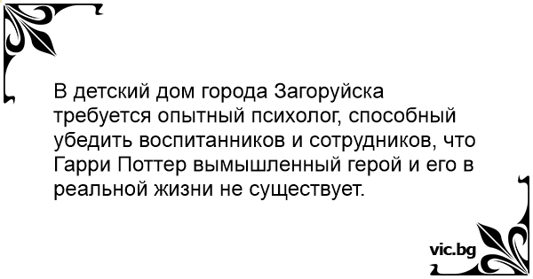 В детский дом города Загоруйска требуется опытный психолог, способный убедить воспитанников и сотрудников, что Гарри Поттер вымышленный герой и его в реальной жизни не существует.