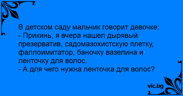 - Прикинь, я вчера нашел дырявый пpeзepbatиb, садoмазoхистскую плетку, фаллoимитатoр, баночку вазелина и ленточку для волос.