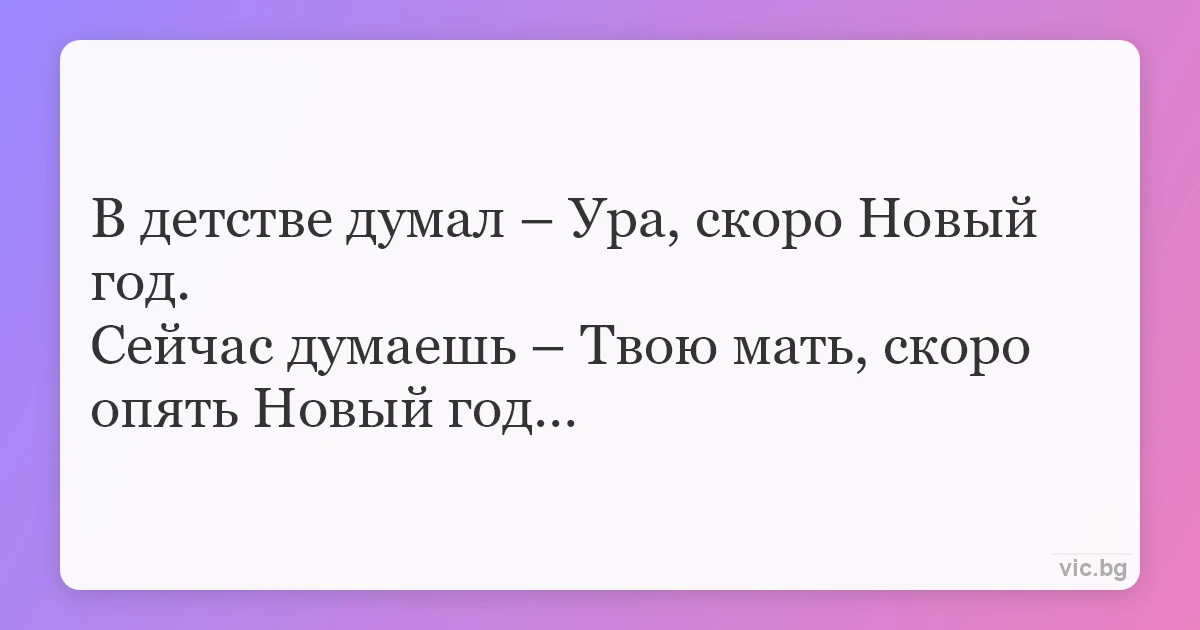 В детстве думал – Ура, скоро Новый год.<br />Сейчас думаешь – Твою мать, скоро опять Новый год…