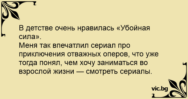 Меня так впечатлил сериал про приключения отважных оперов, что уже тогда понял, чем хочу заниматься во взрослой жизни — смотреть сериалы.