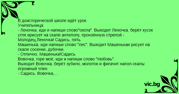 - Леночка, иди и напиши слово"охота". Выходит Леночка, берёт кусок угля ирисует на скале антилопу, пронзённую стрелой - Молодец,Леночка! Садись, пять.