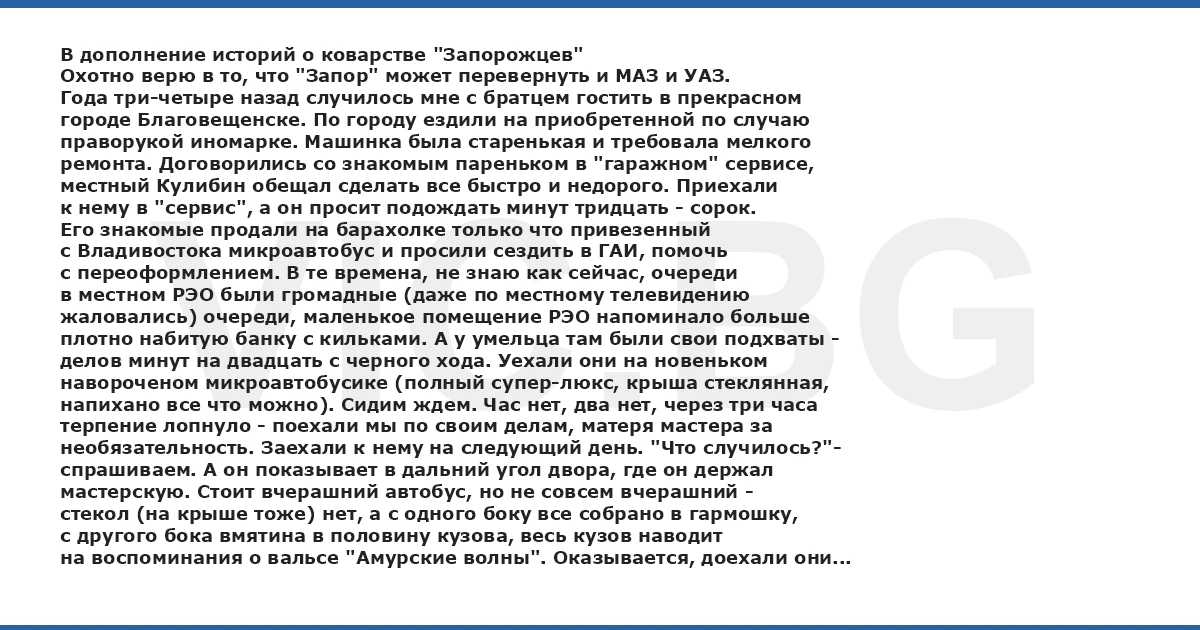 В дополнение историй о коварстве "Запорожцев" Охотно верю в то, что "Запор" может перевернуть и МАЗ и УАЗ. Года три-четыре назад случилось мне с братцем гостить в прекрасном городе Благовещенске. По городу ездили на приобретенной по случаю праворукой иномарке. Машинка была старенькая и требовала мелкого ремонта. Договорились со знакомым пареньком в "гаражном" сервисе, местный Кулибин обещал сделать все быстро и недорого. Приехали к нему в "сервис", а он просит подождать минут тридцать - сорок. Его знакомые продали на барахолке только что привезенный с Владивостока микроавтобус и просили сездить в ГАИ, помочь с переоформлением. В те времена, не знаю как сейчас, очереди в местном РЭО были громадные (даже по местному телевидению жаловались) очереди, маленькое помещение РЭО напоминало больше плотно набитую банку с кильками. А у умельца там были свои подхваты - делов минут на двадцать с черного хода. Уехали они на новеньком навороченом микроавтобусике (полный супер-люкс, крыша стеклянная, напихано все что можно). Сидим ждем. Час нет, два нет, через три часа терпение лопнуло - поехали мы по своим делам, матеря мастера за необязательность. Заехали к нему на следующий день. "Что случилось?"- спрашиваем. А он показывает в дальний угол двора, где он держал мастерскую. Стоит вчерашний автобус, но не совсем вчерашний - стекол (на крыше тоже) нет, а с одного боку все собрано в гармошку, с другого бока вмятина в половину кузова, весь кузов наводит на воспоминания о вальсе "Амурские волны". Оказывается, доехали они вчера до РЭО, быстро все оформили - и назад. Владелец автобуса радостный, и машину взял недорого, и в очереди не "парился". Заговорился, загляделся - на перекрестке, к которому подъезжали, уже красный вот-вот загорится, он и решил проскочить. А в это время на перекресток довольно бодро вылетает "Запор". Удар носом "Запора" в бок микроавтобуса был очень сильным, автобус развернуло и бросило на ближайший столб, помяв другую сторону машины. Владелец с масером оклемались, руки ноги целы, шок у обоих. Выбрались, глянули на то, что еще минуту назад "было шариком" - с владельцем совсем плохо стало. Поворачиваются - а "Запор" почти целый стоит, фара только разбита, бампер передний и немного совсем помяло морду. Из запора дед (ну как и положено) выбирается. Парни его только и смогли спросить: "Как же так ..." А тот, за сердце держится, вокруг них бегает и причитает: "Ой, Ох, Целые все? , я же вот на дачку собрался,.. Как так все получилось нехорошо.., Я вот на дачку кирпичики везу ..." Открывают багажник (для тех, кто забыл как выглядит "Запорожец" - он у него спереди) Багажник под завязку набит .. кирпичом.