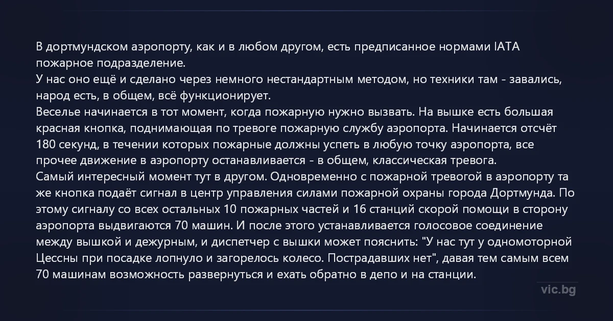 Самый интересный момент тут в другом. Одновременно с пожарной тревогой в аэропорту та же кнопка подаёт сигнал в центр управления силами пожарной охраны города Дортмунда. По этому сигналу со всех остальных 10 пожарных частей и 16 станций скорой помощи в сторону аэропорта выдвигаются 70 машин. И после этого устанавливается голосовое соединение между вышкой и дежурным, и диспетчер с вышки может пояснить: "У нас тут у одномоторной Цессны при посадке лопнуло и загорелось колесо. Пострадавших нет", давая тем самым всем 70 машинам возможность развернуться и ехать обратно в депо и на станции.