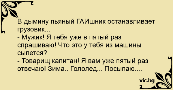 - Товарищ капитан! Я вам уже пятый раз отвечаю! Зима.. Гололед... Посыпаю....