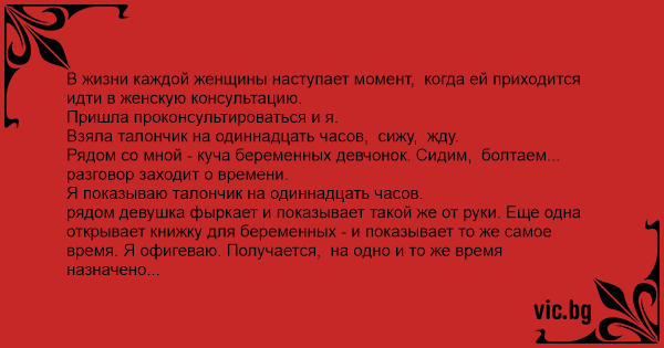рядом девушка фыркает и показывает такой же от руки. Еще одна открывает книжку для беременных - и показывает то же самое время. Я офигеваю. Получается, на одно и то же время назначено трое человек? Нормально. Врачу остается только разорваться.