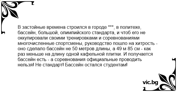 В застойные времена строился в городе ***, в политехе, бассейн, большой, олимпийского стандарта, и чтоб его не оккупировали своими тренировками и соревнованиями многочисленные спортсмены, руководство пошло на хитрость - оно сделало бассейн не 50 метров длины, а 49 м 85 см - как раз меньше на длину одной кафельной плитки. И получается бассейн есть - а соревнования официальные проводить нельзя! Не стандарт! Бассейн остался студентам!