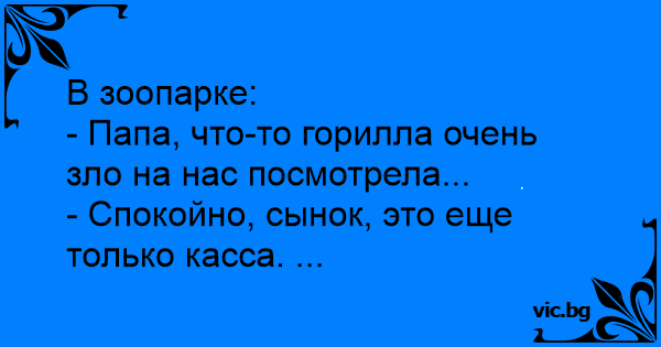 В зоопарку: — Тато, щось горила дуже зло на нас подивилася ... — Спокійно, синку - це ще тільки каса.