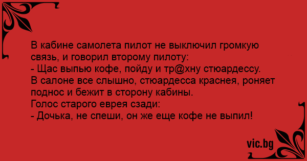 Салон самолета. Пилоты сказали всю инфу и забыли выключить микрофон. На весь салон: - Ну, сейчас чайку попьем, потом стюардессу тр@хнем. Стюардесса бежит к кабине пилотов, ее останавливает бабка: - Да не торопись ты так, доча, они же сказали - сначала чай попьют!