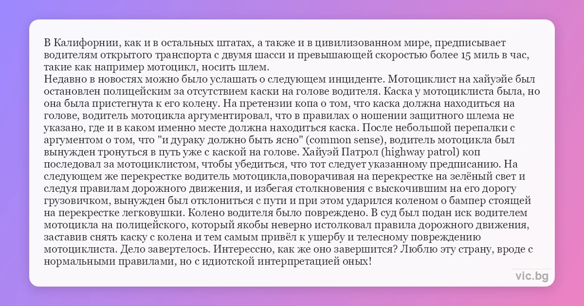 В Калифорнии, как и в остальных штатах, а также и в цивилизованном мире, предписывает водителям открытого транспорта с двумя шасси и превышающей скоростью более 15 миль в час, такие как например мотоцикл, носить шлем. Недавно в новостях можно было услашать о следующем инциденте. Мотоциклист на хайуэйе был остановлен полицейским за отсутствием каски на голове водителя. Каска у мотоциклиста была, но она была пристегнута к его колену. На претензии копа о том, что каска должна находиться на голове, водитель мотоцикла аргументировал, что в правилах о ношении защитного шлема не указано, где и в каком именно месте должна находиться каска. После небольшой перепалки с аргументом о том, что "и дураку должно быть ясно" (common sense), водитель мотоцикла был вынужден тронуться в путь уже с каской на голове. Хайуэй Патрол (highway patrol) коп последовал за мотоциклистом, чтобы убедиться, что тот следует указанному предписанию. На следующем же перекрестке водитель мотоцикла,поворачивая на перекрестке на зелёный свет и следуя правилам дорожного движения, и избегая столкновения с выскочившим на его дорогу грузовичком, вынужден был отклониться с пути и при этом ударился коленом о бампер стоящей на перекрестке легковушки. Колено водителя было повреждено. В суд был подан иск водителем мотоцикла на полицейского, который якобы неверно истолковал правила дорожного движения, заставив снять каску с колена и тем самым привёл к ушербу и телесному повреждению мотоциклиста. Дело завертелось. Интерессно, как же оно завершится? Люблю эту страну, вроде с нормальными правилами, но с идиотской интерпретацией оных!