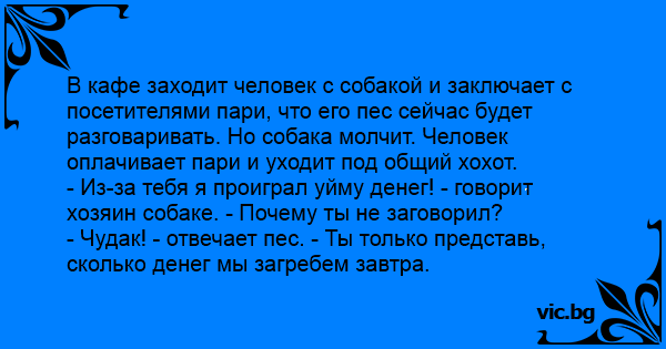 В кафе заходит человек с собакой и заключает с посетителями пари, что его пес сейчас будет разговаривать. Но собака молчит. Человек оплачивает пари и уходит под общий хохот.