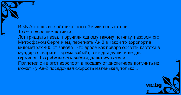 Прилетел он в этот аэропорт, а посадку от диспетчера получить не может - у Ан-2 посадочная скорость маленькая, только пристроится заходить на посадку, как становится помехой для "большой" авиации.