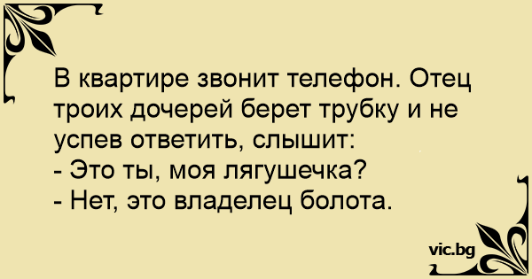 Дзвонить телефон. Трубку піднімає батько трьох дочок. — Привіт! Це ти, моя рибонько? — Нє, блін, це господар акваріума.