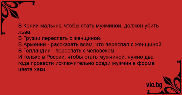 И только в России, чтобы стать мужчиной, нужно два года провести исключительно среди мужчин в форме