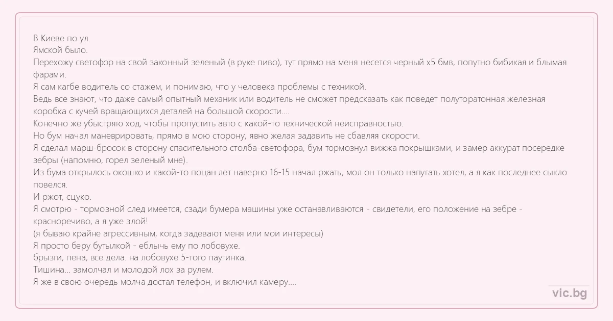 В Киеве по ул. Ямской было. Перехожу светофор на свой законный зеленый (в руке пиво), тут прямо на меня несется черный х5 бмв, попутно бибикая и блымая фарами. Я сам кагбе водитель со стажем, и понимаю, что у человека проблемы с техникой. Ведь все знают, что даже самый опытный механик или водитель не сможет предсказать как поведет полуторатонная железная коробка с кучей вращающихся деталей на большой скорости.... Конечно же убыстряю ход, чтобы пропустить авто с какой-то технической неисправностью. Но бум начал маневрировать, прямо в мою сторону, явно желая задавить не сбавляя скорости. Я сделал марш-бросок в сторону спасительного столба-светофора, бум тормознул вижжа покрышками, и замер аккурат посередке зебры (напомню, горел зеленый мне). Из бума открылось окошко и какой-то поцан лет наверно 16-15 начал ржать, мол он только напугать хотел, а я как последнее сыкло повелся. И ржот, сцуко. Я смотрю - тормозной след имеется, сзади бумера машины уже останавливаются - свидетели, его положение на зебре - красноречиво, а я уже злой! (я бываю крайне агрессивным, когда задевают меня или мои интересы) Я просто беру бутылкой - еблычь ему по лобовухе. брызги, пена, все дела. на лобовухе 5-того паутинка. Тишина... замолчал и молодой лох за рулем. Я же в свою очередь молча достал телефон, и включил камеру. Пока я мастырил камеру, чмо за крутой машиной очнулось, и кинулось в бой: Выскочило ко мне, и кричало, мол, его папик меня с говном съест, а его бодигвард-чечены выебут в жёп. Я молча обошел машину, кругом снимая все на моб (психологически я тролль еще тот!), вернулся к верещащему подонку. Спросил: - Сколько стоит это видео? Он открыл было рот, чтобы что-то ответить, но его испуг в глазах был моим триумфом! Это было самое несчастное, самое никчемное существо в мире, которое поняло, что власть его - теперь моя, и теперь я над ним главный! Не даром говорят: сделал паузу - держи! Мелкого хуя явно перетрухнуло, я же положил мобильник в карман, брякнул: - встретимся! ...и пошел прочь. Если честно, я ожидал, что он мне стрельнет в спину. Но мой блеф сработал - оно пересрало больше чем я за пару секунд до этого! знал бы он, что я настроил видеокамеру мобильника на сохранение в флешку, а вчера ее вынул... знал бы он, что я не мог нормально говорить, потому что меня заклинило.... Знал бы он, что я как можно быстрее хотел убежать, чтобы выпить пива и снять испуг.... Но все меркнет, ибо: Я ТОГДА ПОБЕДИЛ! И теперь думаю, то чмо богатое теперь старается не нарушать ПДД