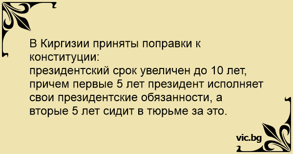 В Киргизии приняты поправки к конституции:<br />президентский срок увеличен до 10 лет, причем первые 5 лет президент исполняет свои президентские обязанности, а вторые 5 лет сидит в тюрьме за это.