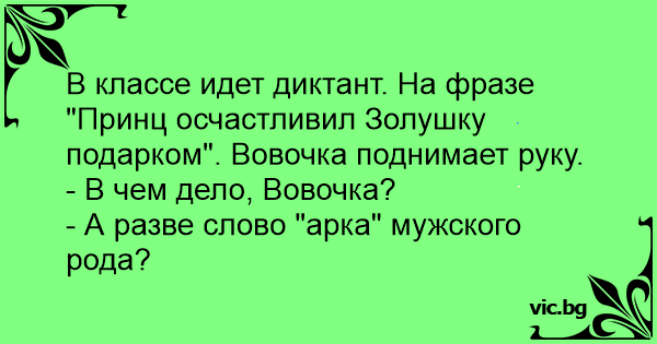 В классе идет диктант. На фразе "Принц осчастливил Золушку подарком". Вовочка поднимает руку.