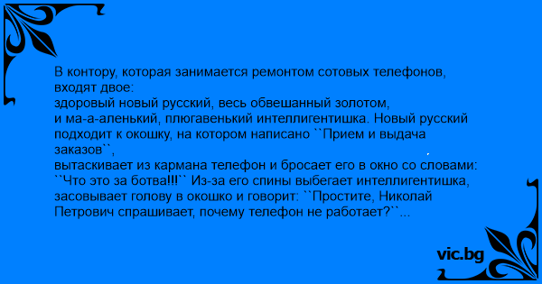 входят двое: здоровый новый русский, весь обвешанный золотом, и ма-а-аленький, плюгавенький интеллигентишка. Новый русский подходит к окошку, на котором написано ``Прием и выдача заказов``, вытаскивает из кармана телефон и бросает его в окно со словами: ``Что это за ботва!!!`` Из-за его спины выбегает интеллигентишка, засовывает голову в окошко и говорит: ``Простите, Николай Петрович спрашивает, почему телефон не работает?`` Девушка, обитающая по ту сторону окошка, берет телефон и несет его проверить. Через некоторое время она возвращается и протягивает новому русскому другой телефон, мол, тот сломан, посмотрите этот. Новый русский берет в руки телефон:``Что это за ботва?!?!?!?`` Интеллигентишка:``Николай Петрович интересуется, как он работает?``