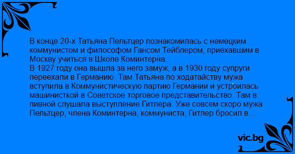 На что бывший члeн Коминтерна, узник концлагеря, жертва нацизма и муж Татьяны Ивановны Пельтцер Ганс Тейблер заметил: "Да, конечно, Гитлер был очень нехороший человек, на нем много грехов, но в нашей разлуке он не виноват. Я у Танечки нечаянно обнаружил в кармане фартука любовную записку от моего лучшего друга..."