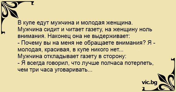 В едно купе пътуват мъж и млада жена. Мъжът чете вестник и не обръща никакво внимание на жената. Накрая тя не издържа.