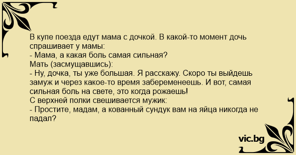 В купе поезда едут мама с дочкой. В какой-то момент дочь спрашивает у мамы: - Мама, а какая боль самая сильная? Мать (засмущавшись): - Ну, дочка, ты уже большая. Я расскажу. Скоро ты выйдешь замуж и через какое-то время забеременеешь. И вот, самая сильная боль на свете, это когда рожаешь! С верхней полки свешивается мужик: - Простите, мадам, а кованный сундук вам на яйца никогда не падал?