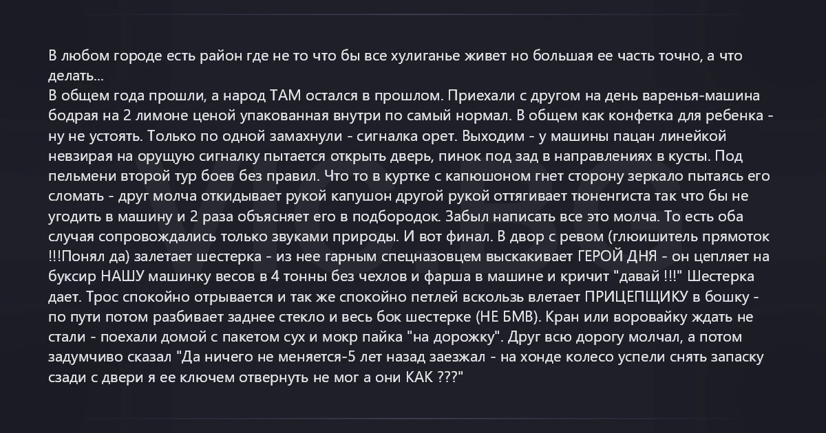 В любом городе есть район где не то что бы все хулиганье живет но большая ее часть точно, а что делать... В общем года прошли, а народ ТАМ остался в прошлом. Приехали с другом на день варенья-машина бодрая на 2 лимоне ценой упакованная внутри по самый нормал. В общем как конфетка для ребенка - ну не устоять. Только по одной замахнули - сигналка орет. Выходим - у машины пацан линейкой невзирая на орущую сигналку пытается открыть дверь, пинок под зад в направлениях в кусты. Под пельмени второй тур боев без правил. Что то в куртке с капюшоном гнет сторону зеркало пытаясь его сломать - друг молча откидывает рукой капушон другой рукой оттягивает тюненгиста так что бы не угодить в машину и 2 раза объясняет его в подбородок. Забыл написать все это молча. То есть оба случая сопровождались только звуками природы. И вот финал. В двор с ревом (глюишитель прямоток !!!Понял да) залетает шестерка - из нее гарным спецназовцем выскакивает ГЕРОЙ ДНЯ - он цепляет на буксир НАШУ машинку весов в 4 тонны без чехлов и фарша в машине и кричит "давай !!!" Шестерка дает. Трос спокойно отрывается и так же спокойно петлей вскользь влетает ПРИЦЕПЩИКУ в бошку - по пути потом разбивает заднее стекло и весь бок шестерке (НЕ БМВ). Кран или воровайку ждать не стали - поехали домой с пакетом сух и мокр пайка "на дорожку". Друг всю дорогу молчал, а потом задумчиво сказал "Да ничего не меняется-5 лет назад заезжал - на хонде колесо успели снять запаску сзади с двери я ее ключем отвернуть не мог а они КАК ???"