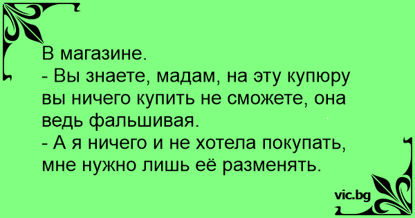 - Вы знаете, мадам, на эту купюру вы ничего купить не сможете, она ведь фальшивая.