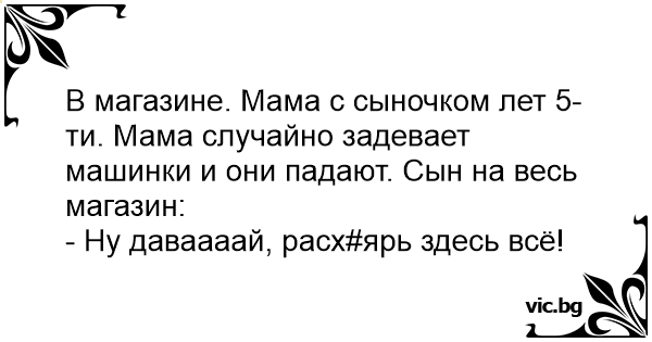 В магазине. Мама с сыночком лет 5-ти. Мама случайно задевает машинки и они падают. Сын на весь магазин: