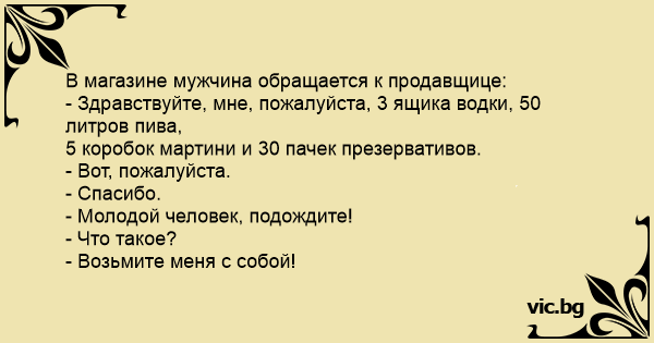 — Доброго дня, мені, будь-ласка, 3 ящики горілки, 50 літрів пива, 4 ящики мартіні і 30 пачок презервативів. — Ось, будь-ласка. — Дякую. — Хлопче, зачекайте! — Що? — Візьміть мене з собою!
