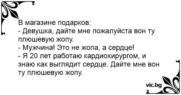 14 лютого. У крамниці: - Дайте мені, будь ласка, ту червону плюшеву дупу. - Чоловік, це не дупа, а серце! - Знаєте, я 20 років кардіохірургом працюю. Дайте мені ту червону плюшеву дупу.