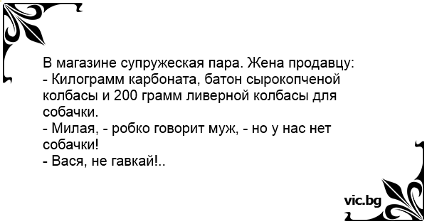 - Килограмм карбоната, батон сырокопченой колбасы и 200 грамм ливерной колбасы для собачки.