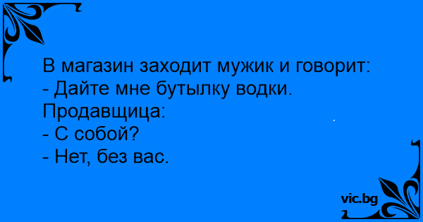 В магазин заходит мужик и говорит:<br />- Дайте мне бутылку водки. <br />Продавщица: <br />- С собой? <br />- Нет, без вас.