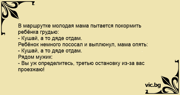 Мајка и бебе патувале во автобус. Детето почнало да плаче. Мајката земала да го дои, но тоа не престанувало. - Јади ако јадеш инаку ќе ја дадам на чичкото! Поминало некое време и човекот до неа не...