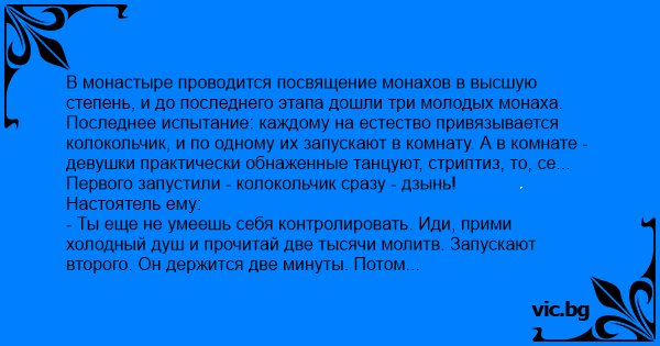 - Ты еще не умеешь себя контролировать. Иди, прими холодный душ и прочитай две тысячи молитв. Запускают второго. Он держится две минуты. Потом раздается тихий звон колокольчика. Настоятель отправляет его принимать холодный душ и читать тысячу молитв. Подошла очередь третьего. Зашел он туда, девушки танцуют вокруг него, практически все с себя поснимали. А монаху хоть бы хны. Ну, настоятель обрадовался: