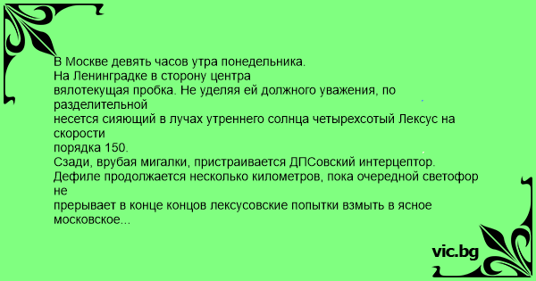 В Москве девять часов утра понедельника. На Ленинградке в сторону центра вялотекущая пробка. Не уделяя ей должного уважения, по разделительной несется сияющий в лучах утреннего солнца четырехсотый Лексус на скорости порядка 150. Сзади, врубая мигалки, пристраивается ДПСовский интерцептор. Дефиле продолжается несколько километров, пока очередной светофор не прерывает в конце концов лексусовские попытки взмыть в ясное московское небо. Из перехватчика с перекошенным лицом кряхтя вылезает коренастый работник ДПС и, явно выполняя для восстановления душевного равновесия сложную дыхательную гимнастику, приближается к злополучной торпеде. Классические по содержанию переговоры заканчиваются классически - несчастному менту попадает в руки некая карточка в ламинате, на обороте которой за увесистой подписью генерала милиции содержится лаконичная фраза, настоятельно рекомендующая всем работникам подразделений ГИБДД оказывать предьявителю сего документа посильную помощь и всяческое содействие. К сожалению, саркастические интонации, щедро раскрасившие вопрос "И какое содействие вам оказать?", невозможно передать словами. Ответ, исполненный не меньшего сарказма, пришел с телетайпной скоростью: - Знаете, мне конечно очень неудобно просить вас, но тут такая пробка, а я как назло очень спешу... Не могли бы мы с вами доехать с включенными мигалками до белорусского вокзала? Занавес.