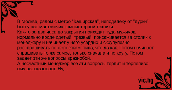 Как-то за два часа до закрытия приходит туда мужичок, нормально вроде одетый, трезвый, присаживается за столик к менеджеру и начинает у него усердно и скрупулёзно расспрашивать по железякам: типа, что да как. Потом начинает спрашивать то же самое, только сначала и по кругу. Потом задаёт эти же вопросы вразнобой.