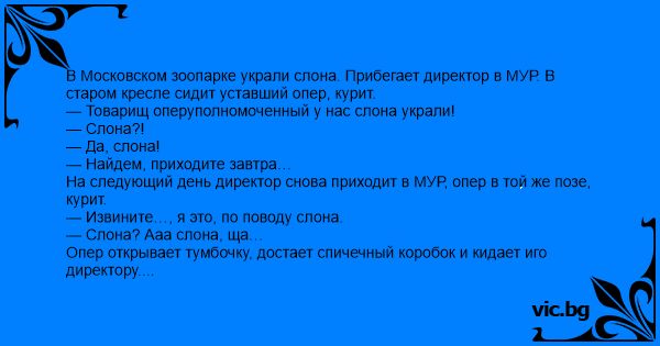 В Московском зоопарке украли слона. Прибегает директор в МУР. В старом кресле сидит уставший опер, курит.