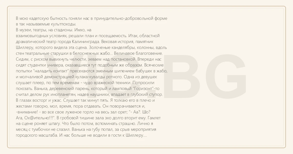 В мою кадетскую бытность гоняли нас в принудительно-добровольной форме в так называемые культпоходы. В музеи, театры, на стадионы. Имхо, на взаимовыгодных условиях, решали план и посещаемость. Итак, областной драматический театр города Калининграда. Вековая история, памятник Шиллеру, которого видела эта сцена. Золоченые канделябры, колонны, вдоль стен театральные старушки в белоснежных жабо... Величавое благоговение. Сидим, с риском вывихнуть челюсти, зеваем над постановкой. Впереди нас сидят студентки универа, оказавшиеся тут подобным же образом. Всяческие попытки "наладить контакт" пресекаются змеиным шипением бабушек в жабо, и молчаливой демонстрацией кулака-кувалды ротного. Одна из девушек слушает плеер, по тем временам - чудо вражеской техники. Попросили поюзать. Ванька, деревенский парень, который и ламповый "Горизонт"-то считал делом рук инопланетян, надев наушники, впадает в глубокий ступор. В глазах восторг и ужас. Слушает так минут пять. Я толкаю его в плечо и жестами говорю, мол, время, пора отдавать. Он поворачивается и, -внимание! - во все свое луженое горло на весь зал орет; "- Аа?. Шо? Ага, Ох@ительно!!!". В гробовой тишине зала эхо долго вторит ему. Гамлет на сцене роняет шпагу. Что было потом, вспоминать страшно. Лично я месяц с тумбочки не слазил. Ванька на губу попал, за срыв мероприятия городского масштаба. И нас больше не водили в гости к Шиллеру. Только на стадионы. ----- obsidian_edge