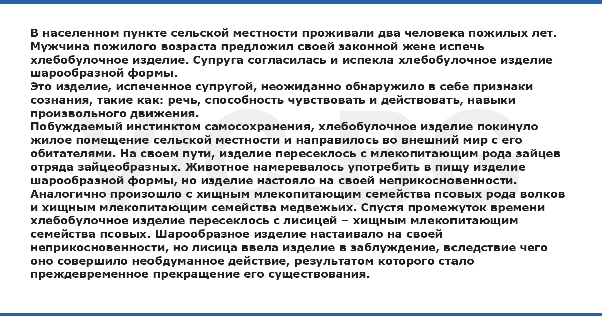 В населенном пункте сельской местности проживали два человека пожилых лет. Мужчина пожилого возраста предложил своей законной жене испечь хлебобулочное изделие. Супруга согласилась и испекла хлебобулочное изделие шарообразной формы. Это изделие, испеченное супругой, неожиданно обнаружило в себе признаки сознания, такие как: речь, способность чувствовать и действовать, навыки произвольного движения. Побуждаемый инстинктом самосохранения, хлебобулочное изделие покинуло жилое помещение сельской местности и направилось во внешний мир с его обитателями. На своем пути, изделие пересеклось с млекопитающим рода зайцев отряда зайцеобразных. Животное намеревалось употребить в пищу изделие шарообразной формы, но изделие настояло на своей неприкосновенности. Аналогично произошло с хищным млекопитающим семейства псовых рода волков и хищным млекопитающим семейства медвежьих. Спустя промежуток времени хлебобулочное изделие пересеклось с лисицей – хищным млекопитающим семейства псовых. Шарообразное изделие настаивало на своей неприкосновенности, но лисица ввела изделие в заблуждение, вследствие чего оно совершило необдуманное действие, результатом которого стало преждевременное прекращение его существования.