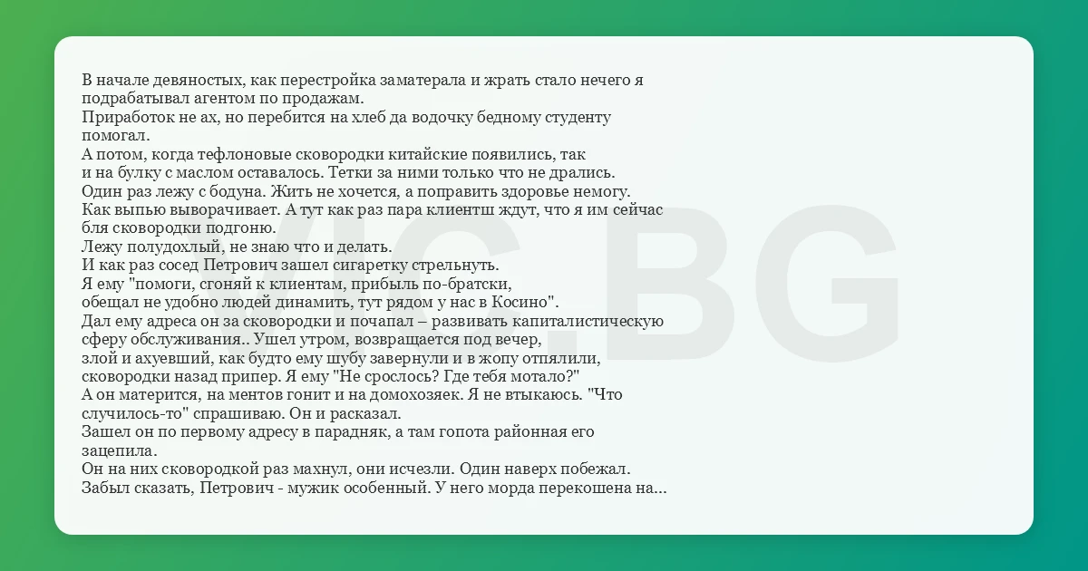 В начале девяностых, как перестройка заматерала и жрать стало нечего я подрабатывал агентом по продажам. Приработок не ах, но перебится на хлеб да водочку бедному студенту помогал. А потом, когда тефлоновые сковородки китайские появились, так и на булку с маслом оставалось. Тетки за ними только что не дрались. Один раз лежу с бодуна. Жить не хочется, а поправить здоровье немогу. Как выпью выворачивает. А тут как раз пара клиентш ждут, что я им сейчас бля сковородки подгоню. Лежу полудохлый, не знаю что и делать. И как раз сосед Петрович зашел сигаретку стрельнуть. Я ему "помоги, сгоняй к клиентам, прибыль по-братски, обещал не удобно людей динамить, тут рядом у нас в Косино". Дал ему адреса он за сковородки и почапал – развивать капиталистическую сферу обслуживания.. Ушел утром, возвращается под вечер, злой и ахуевший, как будто ему шубу завернули и в жопу отпялили, сковородки назад припер. Я ему "Не срослось? Где тебя мотало?" А он матерится, на ментов гонит и на домохозяек. Я не втыкаюсь. "Что случилось-то" спрашиваю. Он и расказал. Зашел он по первому адресу в парадняк, а там гопота районная его зацепила. Он на них сковородкой раз махнул, они исчезли. Один наверх побежал. Забыл сказать, Петрович - мужик особенный. У него морда перекошена на одну сторону, будто скалится. Паралич лицевого нерва. Короче кто этого перца в первый раз видит сигарету стрелять забздит. Поднялся Петрович на этаж, звонит. Ему клиентша моя открывает и тут же на месте хуеет. А он заведеный после этой херни с малолетками, сковородкой крутит и деньгу требует. А тут и крысеныш тот самый, что наверх убержал в прихожей нарисовался. Увидел Петровича и тут же мимо него на лестницу дернул. Тетка глаза вылупила в полном ахуе, Петрович ей про нашу договоренность втолковывает, а она вообще догнать не может о чем он. Пока он ей толковал крысеныш этот соседа мента из нашего РУВД успел позвать. Тот сразу примчался, ксивой трясет да заарестовал Петровича. Приехали менты из отделения и Петровича приняли. Такая вот торговля у него вышла. Я потом тоже в отделение ходил показания давал напару с Петровичем. Следак, к которому пришли минут 5 меня послушал, а потом как начал ржать. Я сижу напротив него и не знаю смеятся или плакать. А он ржет, потом Петровича позвал из предбанника, "пиздуйте на хуй, коробейники-сковородники" говорит "с вас поляна и дела не будет" а сам уссывается. Мы постояли, сначала я заржал, а потом уже и Петровича сломало. Хорошая была сцена когда следака и двоих подельников со смеха крючит. Во век не забуду. Мы потом им поляну накрыли, но это уже другая история.