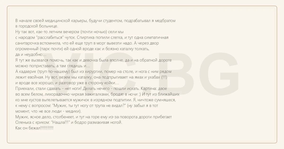 А кадаврик (труп по-нашему) был из хирургии, помер на столе, и нога с ним рядом