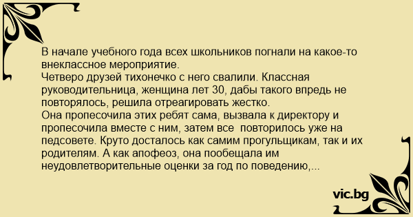 Четверо друзей тихонечко с него свалили. Классная руководительница, женщина лет 30, дабы такого впредь не повторялось, решила отреагировать жестко.