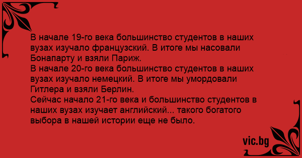 В начале 19-го века большинство студентов в наших вузах изучало французский. В итоге мы насовали Бонапарту и взяли Париж.