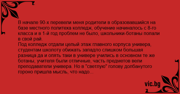 В начале 90-х перевели меня родители в образовавшийся на базе местного политеха колледж, обучение начиналось с 8-го класса и в 1-й год проблем не было, школьники-ботаны попали в свой рай.
