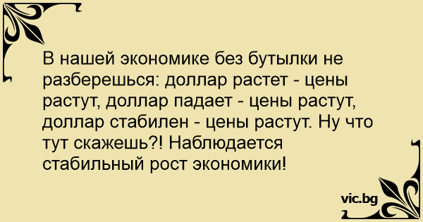 В нашей экономике без бутылки не разберешься: доллар растет - цены растут, доллар падает - цены растут, доллар стабилен - цены растут. Ну что тут скажешь?! Наблюдается стабильный рост экономики!