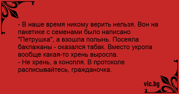- В наше время никому верить нельзя. Вон на пакетике с семенами было написано "Петрушка", а взошла полынь. Посеяла баклажаны - оказался табак. Вместо укропа вообще какая-то хрень выросла.