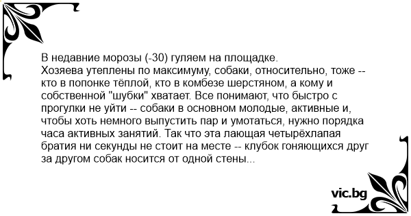 Хозяева утеплены по максимуму, собаки, относительно, тоже -- кто в попонке тёплой, кто в комбезе шерстяном, а кому и собственной "шубки" хватает. Все понимают, что быстро с прогулки не уйти -- собаки в основном молодые, активные и, чтобы хоть немного выпустить пар и умотаться, нужно порядка часа активных занятий. Так что эта лающая четырёхлапая братия ни секунды не стоит на месте -- клубок гоняющихся друг за другом собак носится от одной стены площадки до другой.