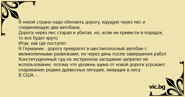 В Германии - дорогу превратят в шестиполосный автобан с великолепными развязками, но через день после завершения работ Конституционный суд на экстренном заседании запретит ее использование, потому что уровень шума от новой дороги угрожает спариванию редких древесных лягушек, живущих в лесу.