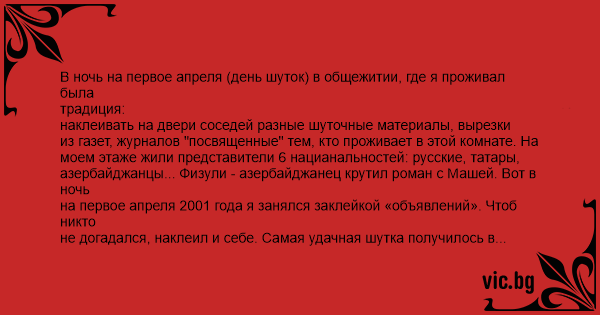 В ночь на первое апреля (день шуток) в общежитии, где я проживал была традиция: