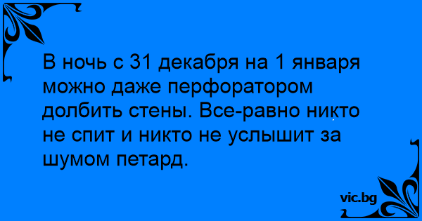 В ночь с 31 декабря на 1 января можно даже перфоратором долбить стены. Все-равно никто не спит и никто не услышит за шумом петард.